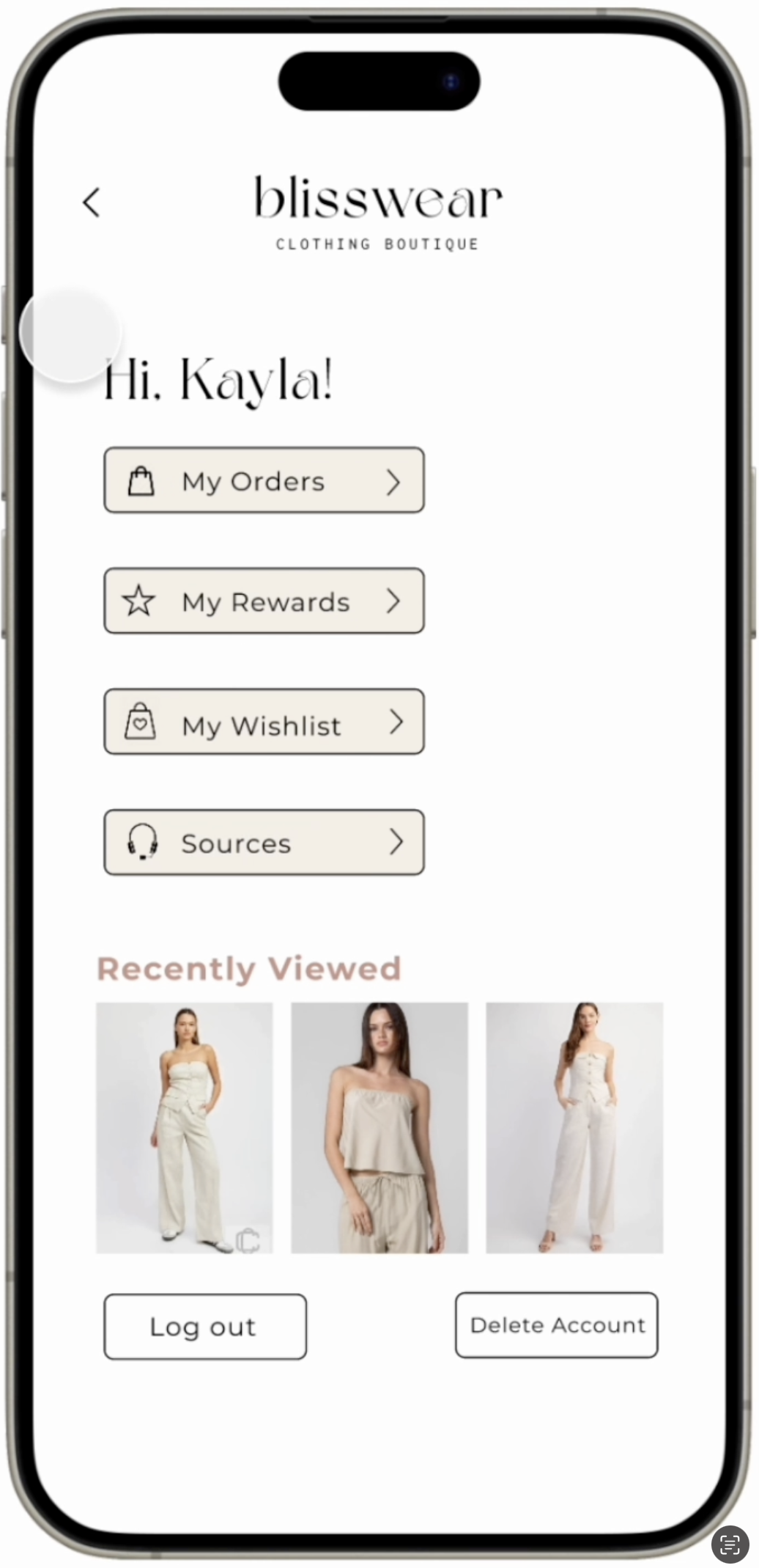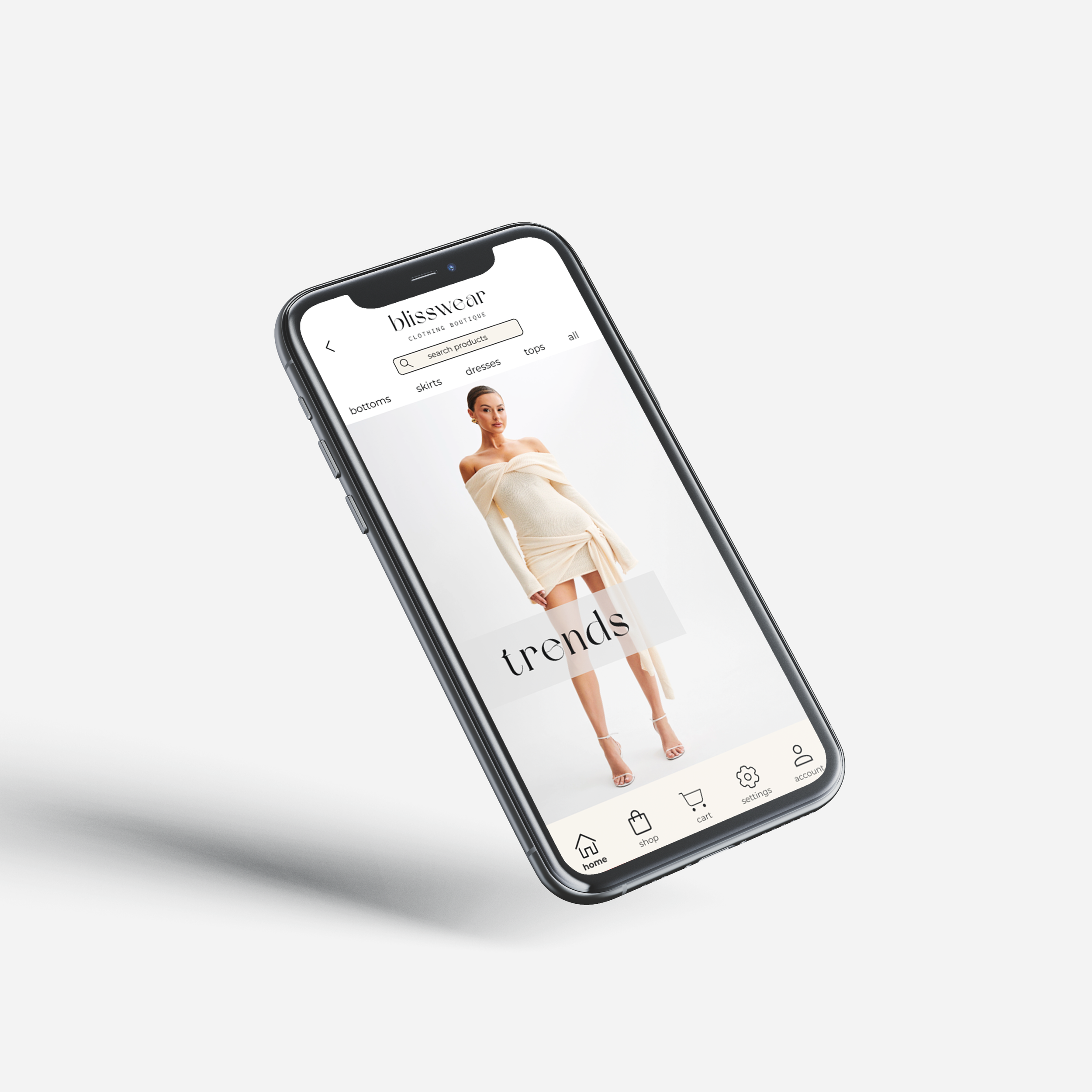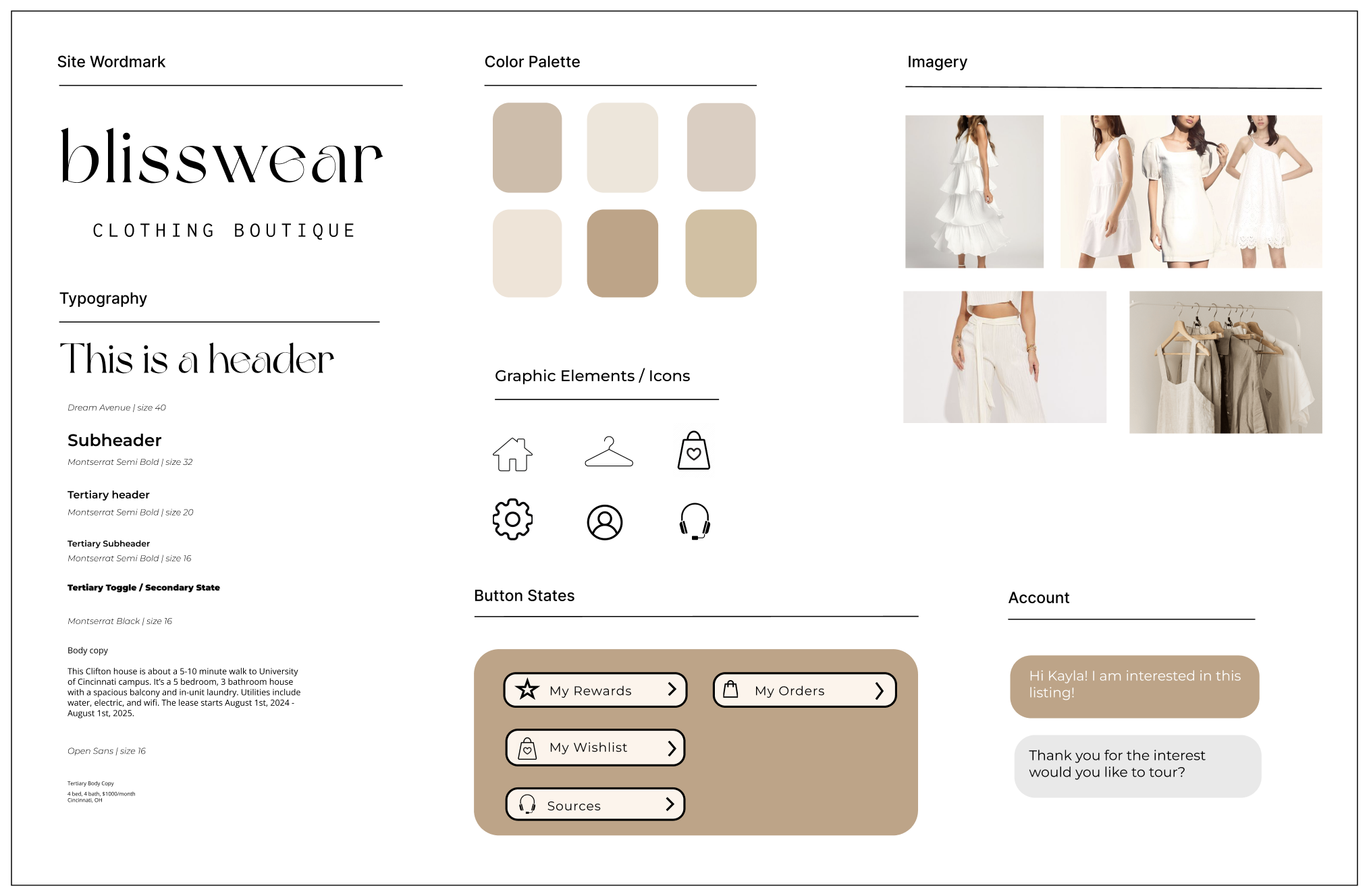 Blisswear Boutique is a high-end boutique defined by minimalist, timeless fashion in soft neutral tones like beige and white. I began this as a personal branding project and later expanded it into an app interaction concept for my Interaction Design class.