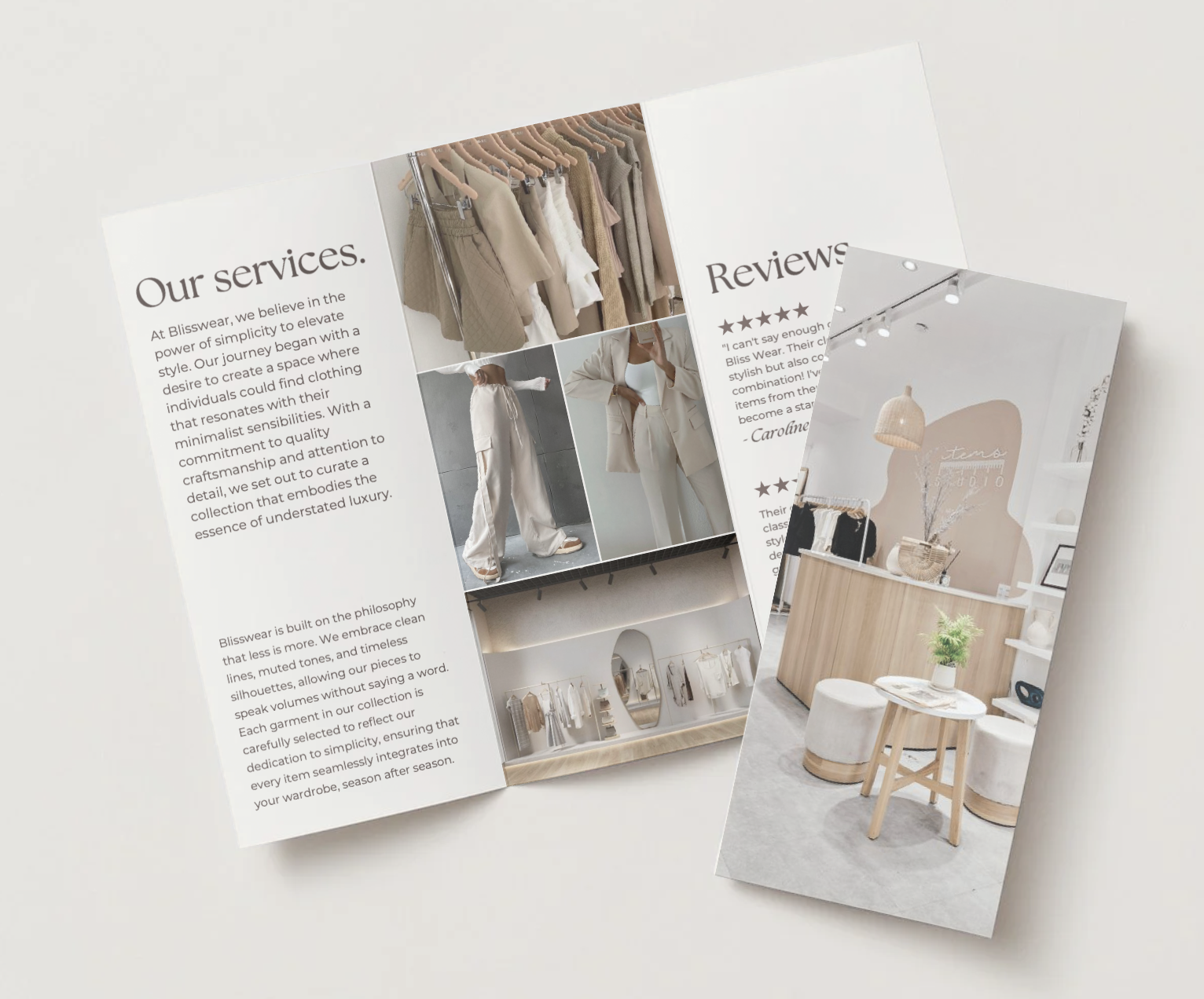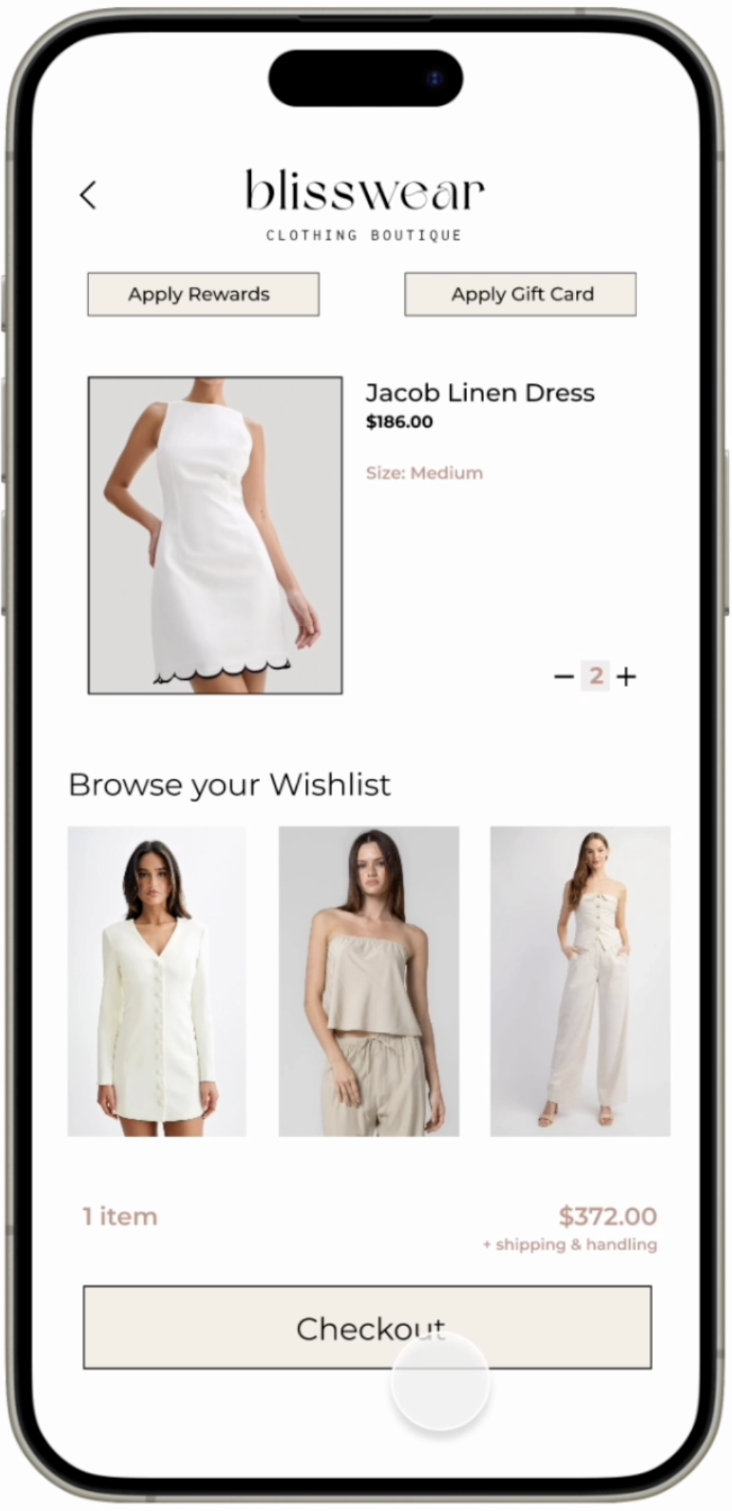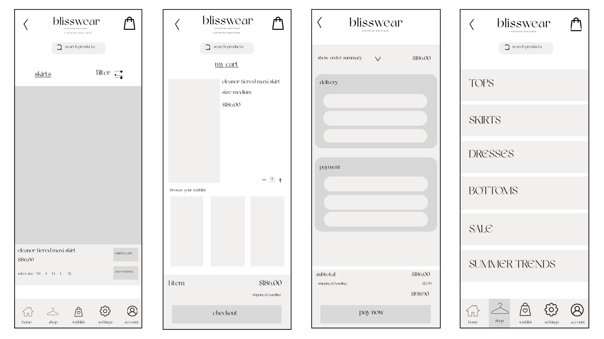 Blisswear Boutique is a high-end boutique defined by minimalist, timeless fashion in soft neutral tones like beige and white. I began this as a personal branding project and later expanded it into an app interaction concept for my Interaction Design class.